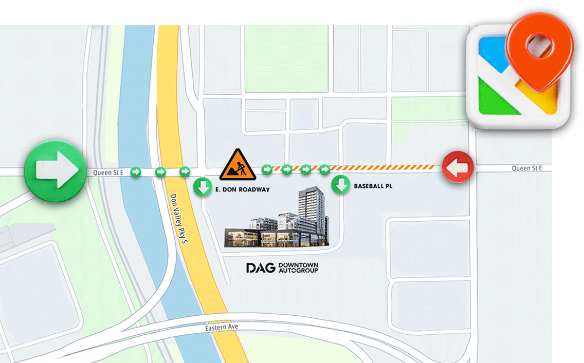 Your best route to the Downtown Autoplex is across Dundas Street or Gerrard Street, then south on River Street to Queen Street East. From there, you can access the Autoplex via Don Roadway or Baseball Place, whichever works best for you.